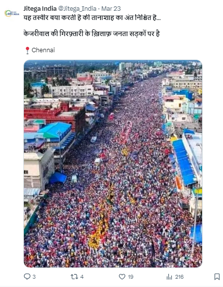 सोशल मीडिया पर वायरल पोस्ट के कैप्शन में लिखा गया है ”यह तस्वीर बया करती है की तानाशाह का अंत निश्चित है… केजरीवाल की गिरफ़्तारी के ख़िलाफ़ जनता सड़कों पर है, चेन्नई।”