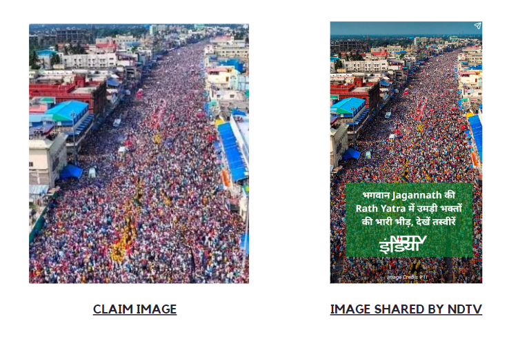 जांच में आगे हमने ‘जगन्नाथ पुरी रथ यात्रा’ कीवर्ड को गूगल सर्च किया, जिसके परिणाम में हमें NDTV द्वारा प्रकाशित एक वेब स्टोरी में यह तस्वीर नज़र आयी। केजरीवाल की गिरफ्तारी के खिलाफ हुए प्रदर्शन की बताई गयी तस्वीर से इसकी तुलना करने पर हमें दोनों ही तस्वीर समान नज़र आती हैं। NDTV इंडिया द्वारा प्रकशित वेब स्टोरी में बताया गया है कि यह तस्वीर उड़ीसा में भगवान जगन्नाथ की वार्षिक यात्रा में उमड़ी भक्तों की भीड़ की है।