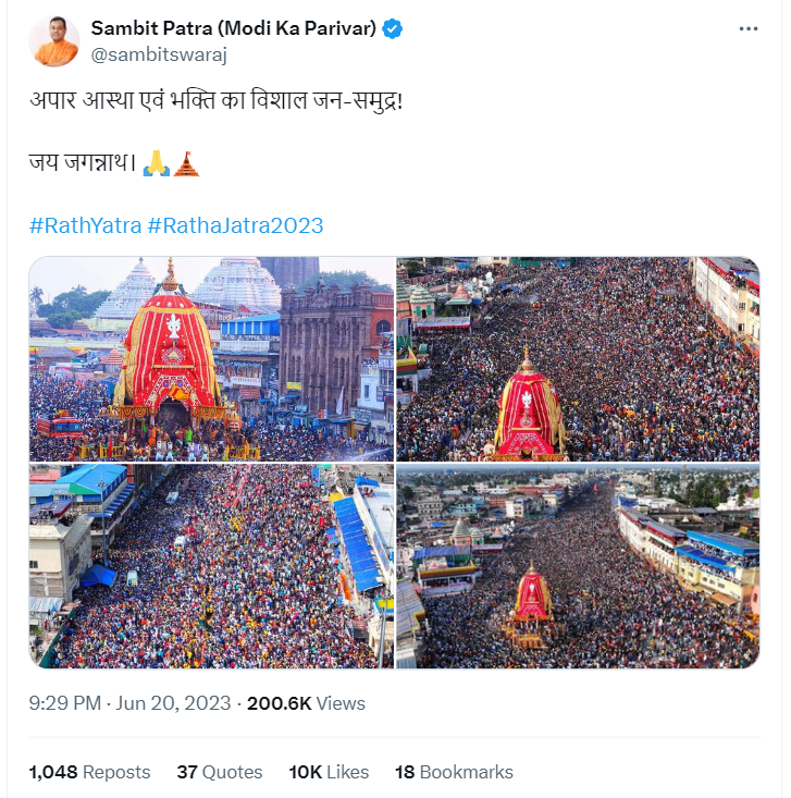 अपनी पड़ताल की शुरुआत में हमने इस तस्वीर को गूगल रिवर्स इमेज सर्च किया। इसके परिणाम में हमें कई सोशल मीडिया पोस्ट प्राप्त हुए, जहाँ इस तस्वीर जैसे दृश्य वाले वीडियो को जगन्नाथपुरी रथ यात्रा का बताया गया है। साथ ही यह तस्वीर 20 जून 2023 को भाजपा के राष्ट्रीय प्रवक्ता संबित पात्रा द्वारा भी शेयर की गयी थी, जिससे यह स्पष्ट हो गया कि यह तस्वीर पुरानी है।