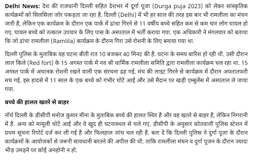 उपरोक्त जानकारी के आधार पर हमने ‘नव श्री धार्मिक लीला कमेटी द्वारा लाल किला मैदान में आयोजित रामलीला में झूला टूटने से हादसा’, ‘नव श्री धार्मिक लीला कमेटी द्वारा लाल किला मैदान में रामलीला तथा मेले का आयोजन’ जैसे कीवर्ड्स को गूगल पर ढूंढा. इस प्रक्रिया में हमें कई ऐसी मीडिया रिपोर्ट्स प्राप्त हुईं, जिनमें रामलीला समारोह के आयोजन तथा इसमें कई बड़ी हस्तियों के शामिल होने की जानकारी दी गई है. इसके अतिरिक्त, हमें ABP News द्वारा 17 अक्टूबर 2023 को प्रकाशित एक लेख प्राप्त हुआ, जिसमें यह जानकारी दी गई है कि नव श्री धार्मिक रामलीला समिति द्वारा आयोजित रामलीला कार्यक्रम में 16 अक्टूबर 2023 को रात 10 बजकर 40 मिनट पर रोशनी रखने वाली एक संरचना ढह गई, जिससे चार लोग घायल हो गए. लेख में नॉर्थ दिल्ली के डीसीपी मनोज कुमार मीना के हवाले से यह जानकारी भी दी गई है कि हादसे में एक बच्चा घायल हो गया था, जिसकी हालत स्थिर है और वह खतरे से बाहर है तथा अन्य को मामूली चोटें आईं और वे खुद ही घटनास्थल से चले गए थे. गौरतलब है कि इनमे से किसी भी मीडिया रिपोर्ट में झूला टूटने से दर्दनाक हादसा होने की कोई जानकारी नहीं दी गई है.