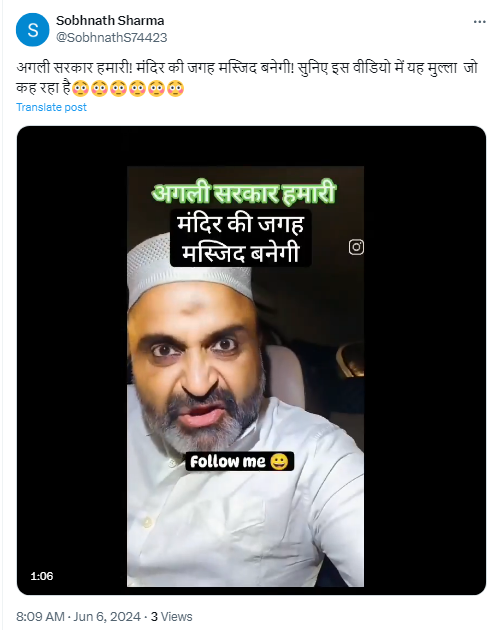 लोकसभा चुनाव के नतीजों के बाद सोशल मीडिया पर एक वीडियो वायरल हो रहा है, जिसमें एक शख्स इस्लामिक टोपी पहनकर धर्म विशेष को अपशब्द कहता नजर आ रहा है. व्यक्ति यह कह रहा है कि अगर हमारी सरकार आती तो अयोध्या में मंदिर की जगह मस्जिद बनती. वीडियो में मौजूद शख्स को मुस्लिम बताया गया है.