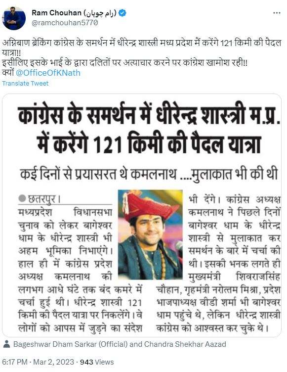 दरअसल, बीते महीने मध्य प्रदेश के पूर्व मुख्यमंत्री कमलनाथ ने बागेश्वर धाम के दर्शन किए थे। मीडिया रिपोर्ट के मुताबिक, इस दौरान उन्होंने बागेश्वर धाम के पीठाधीश्वर धीरेंद्र शास्त्री से भी मुलाकात की थी। इसके बाद बीते सप्ताह धीरेंद्र शास्त्री के भाई शालिग्राम की एक आपराधिक मामले में गिरफ्तारी की भी खबर सामने आई थी। हालांकि, बाद में उन्हें जमानत मिल गई। इस बीच सोशल मीडिया पर पोस्ट शेयर कर धीरेंद्र शास्त्री द्वारा कांग्रेस के समर्थन में पदयात्रा निकालने का दावा किया जा रहा है।