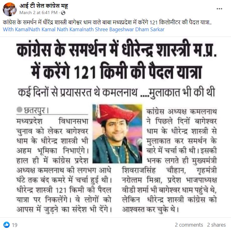 सोशल मीडिया पर एक अखबार की कटिंग के जरिये दावा किया जा रहा है कि कांग्रेस के समर्थन में बागेश्वर धाम के धीरेंद्र शास्त्री, मध्य प्रदेश में 121 किलोमीटर की एक पदयात्रा निकालेंगे।