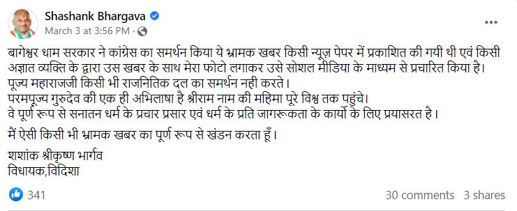 Facebook Post by Congress MLA Shashank Bhargav on March 03,2023