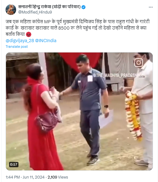 11 जून 2024 को एक्स (आर्काइव) पोस्ट के साथ कैप्शन में लिखा गया है, “जब एक महिला कांग्रेस MP के पूर्व मुख्यमंत्री दिग्विजय सिंह के पास राहुल गांधी के गारंटी कार्ड के खटाखट खटाखट वाले 8500 रू लेने पहुंच गई तो देखो उन्होंने महिला से क्या बर्ताव किया”