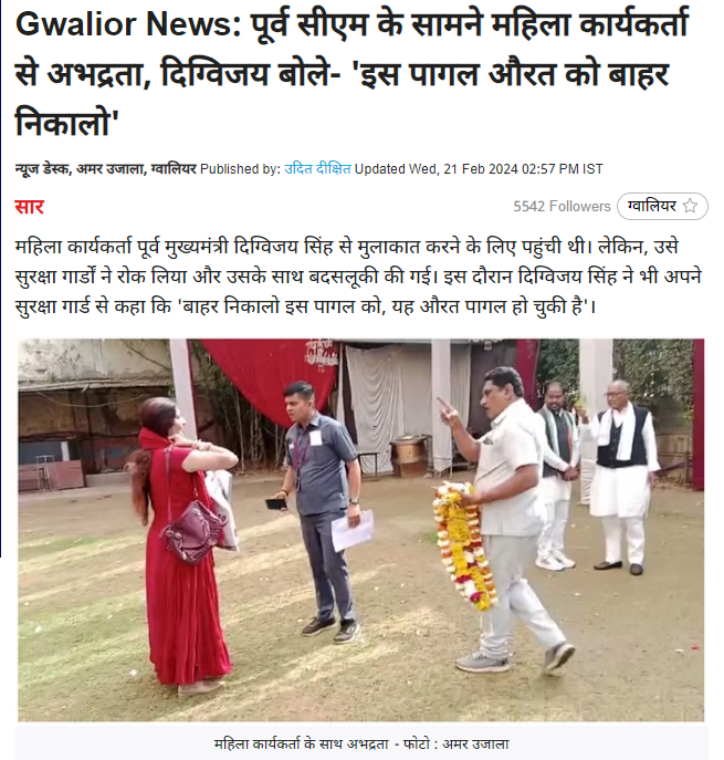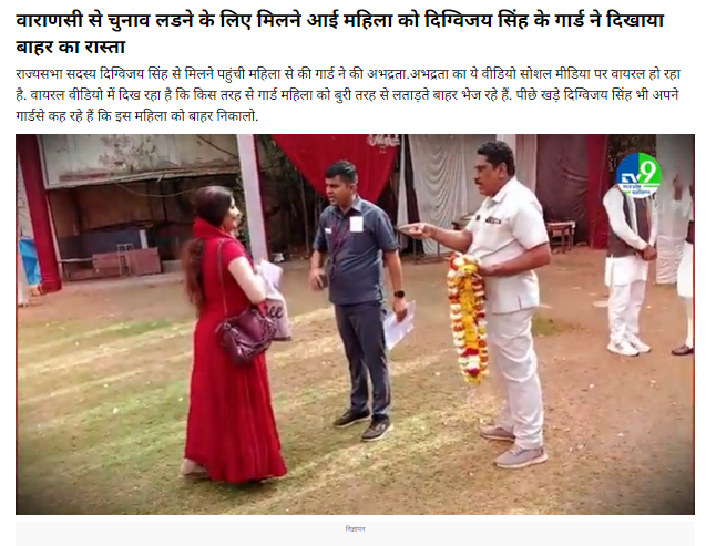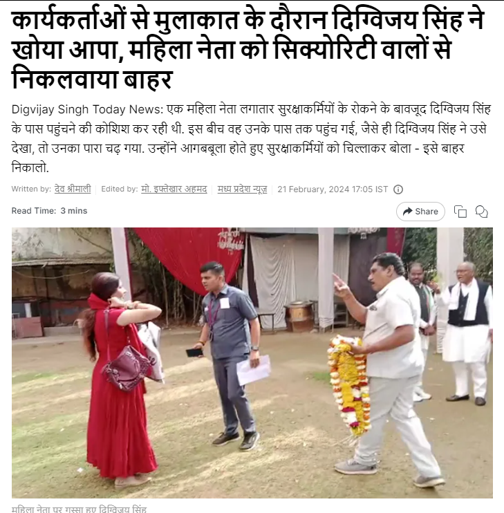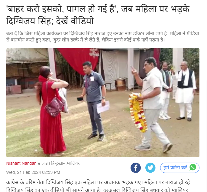 21 फरवरी 2024 को हिन्दुस्तान द्वारा इस वीडियो पर प्रकाशित रिपोर्ट में बताया गया है कि वीडियो में नजर आ रही महिला कांग्रेस कार्यकर्ता डॉ लीना शर्मा हैं। यह घटना 21 फरवरी की है, जब दिग्विजय सिंह ग्वालियर-चम्बल के दौरे पर गए हुए थे। एनडीटीवी द्वारा प्रकाशित रिपोर्ट में बताया गया है कि महिला नेत्री, सुरक्षाकर्मियों के रोकने के बावजूद दिग्विजय सिंह के पास पहुंचने की कोशिश कर रही थी, इसी बीच वह उनके पास तक पहुंच गई। लेकिन जैसे ही दिग्विजय सिंह ने महिला को देखा तो उनका पारा चढ़ गया और उन्होंने सुरक्षाकर्मियों को कहा- इसे बाहर निकालो।
