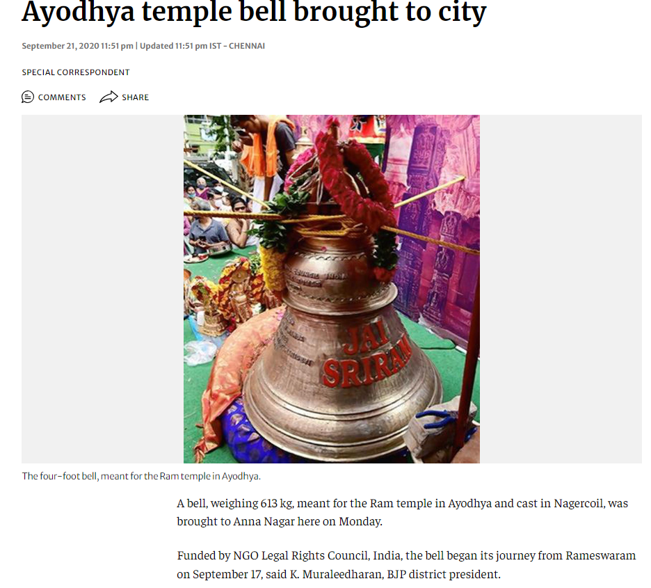 इसी दौरान हमें द हिंदू की वेबसाइट पर 21 सितंबर 2020 को प्रकाशित एक रिपोर्ट भी मिली. इस रिपोर्ट में उक्त घंटे की तस्वीर फ़ीचर इमेज के रूप में मौजूद थी. रिपोर्ट में बताया गया था कि इस घंटे को लीगल राइट्स काउंसिल नाम के एक गैर सरकारी संगठन ने फंड किया है है.