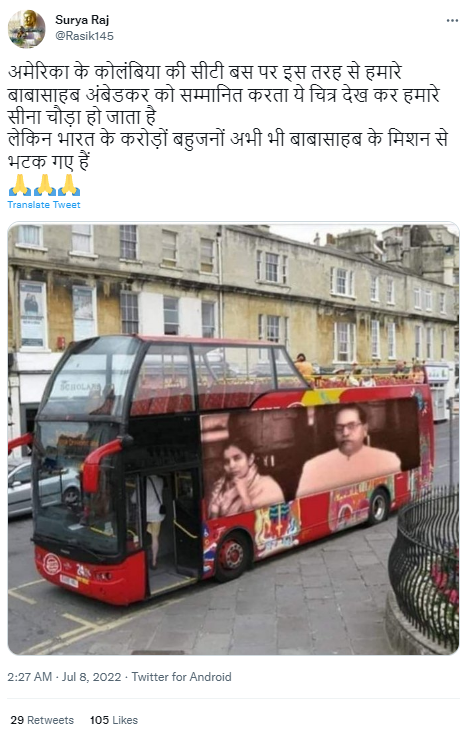 सोशल मीडिया पर एक तस्वीर शेयर कर दावा किया जा रहा है कि कोलंबिया (अमेरिका) की सिटी बस पर बाबासाहब अंबेडकर की तस्वीर लगी है। वायरल तस्वीर में एक बस के ऊपर डॉ भीमराव अंबेडकर और उनकी पत्नी संविता अंबेडकर की तस्वीर को देखा जा सकता है।