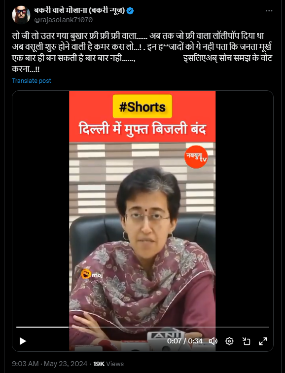 एक्स पोस्ट में इस वीडियो को शेयर करते हुए कैप्शन में लिखा है, ”लो जी लो उतर गया बुखार फ्री फ्री फ्री वाला… अब तक जो फ्री वाला लॉलीपॉप दिया था अब वसूली शुरु होने वाली है कमर कस लो…! . इन ह**जादों को ये नही पता कि जनता मूर्ख एक बार ही बन सकती है बार बार नही…, इसलिए अब सोच समझ के वोट करना…!” एक्स पोस्ट का आर्काइव यहाँ देखें।
