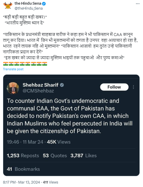 इस तस्वीर के साथ 13 मार्च 2024 को ‘द हिन्दू सेना’ नामक वेरीफाइड एक्स हैंडल से किये गए पोस्ट में लिखा है कि ‘बड़ी बड़ी बहुत बड़ी खबर। भारतीय मुस्लिम ध्यान दे … पाकिस्तान के प्रधानमंत्री शाहबाज शरीफ ने कहा हम ने भी पाकिस्तान में CAA कानून लागू कर दिया। भारत में जिन भी मुसलमानों को लगता है उनपर अत्याचार हो रहा है, भारत रहने लायक नहीं… वो मुस्लमान पाकिस्तान आ जाओ… हम तुरंत उन्हे पाकिस्तानी नागरिकता प्रदान कर देंगे। इस खबर को ज्यादा से ज्यादा मुस्लिम भाइयों तक पहुंचाओ और पुण्य कमाओ। ‘