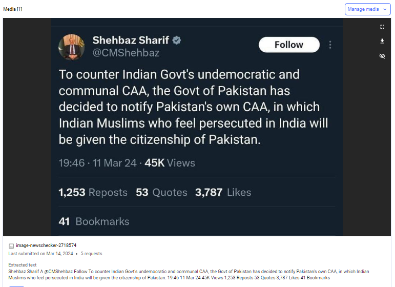 इस कानून को लेकर मच रहे हंगामे के बीच पाकिस्तान के प्रधानमंत्री शहबाज़ शरीफ के कथित एक्स पोस्ट का स्क्रीनशॉट भी सोशल मीडिया पर वायरल है। कथित तौर पर शहबाज़ शरीफ द्वारा 11 मार्च 2024 को किये गए इस पोस्ट में लिखा है – ‘भारत सरकार के अलोकतांत्रिक और सांप्रदायिक CAA का मुकाबला करने के लिए, पाकिस्तान सरकार ने पाकिस्तान के अपने CAA को लागू करने का निर्णय लिया है, जिसमें भारत में प्रताड़ित महसूस करने वाले भारतीय मुसलमानों को पाकिस्तान की नागरिकता दी जाएगी।’