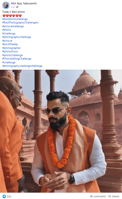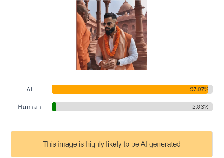 अपनी जांच से हम इस निष्कर्ष पर पहुंचे कि मंदिर में उपस्थित विराट कोहली की तस्वीर असल में एआई का उपयोग करके बनाई गई है।