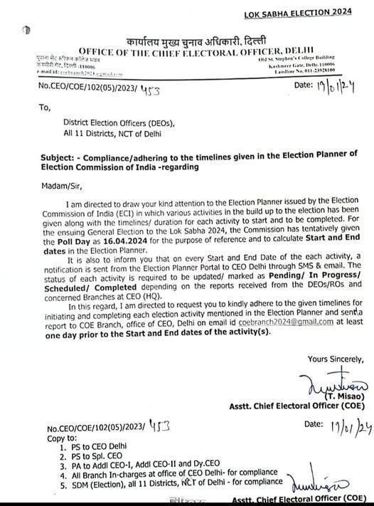 पत्र में कहा गया है कि भारत चुनाव आयोग को आगामी 2024 लोकसभा चुनावों के सुचारू संचालन के लिए निर्धारित समय सीमा के भीतर चुनाव योजना नियमों का अनुपालन और संचालन करने का निर्देश दिया गया है। पत्र में यह भी कहा गया है कि आगामी लोकसभा चुनाव 2024 के लिए, आयोग की तरफ से केवल तैयारी के लिए अस्थायी रूप से मतदान दिवस 16.04.2024 दिया गया है।