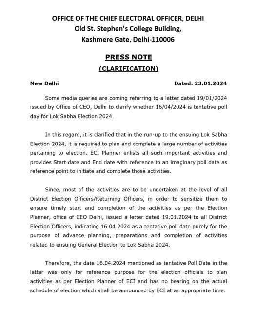 एक्स पोस्ट के साथ संलग्न एक प्रेस नोट में कहा गया है कि- पत्र में अस्थायी मतदान तिथि के रूप में दी गयी तारीख 16.04.2024 चुनाव अधिकारियों के लिए केवल चुनाव योजना के अनुसार गतिविधियों की योजना बनाने के उद्देश्य से दी गयी थी। इसका वास्तविक कार्यक्रम से कोई संबंध नहीं है। इसमें बताया गया है कि चुनाव की घोषणा आयोग द्वारा उचित समय पर की जाएगी।