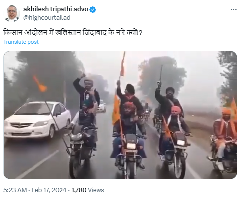 वीडियो में सिख पगड़ी पहने, मोटर साइकिल पर सवार कई युवक ‘खालिस्तान जिंदाबाद’ के नारे लगा रहे हैं। सोशल मीडिया यूज़र्स ने इस वीडियो को हालिया किसान आंदोलन से जोड़कर शेयर किया है। एक एक्स यूज़र्स ने इस वीडियो को शेयर करते हुए कैप्शन में लिखा है कि ‘किसान आंदोलन में खलिस्तान जिंदाबाद के नारे क्यों!?‘