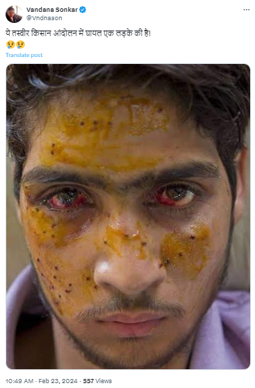 इस तस्वीर में दिख रहा है कि लड़के का चेहरा पैलेट गन की चोट से बुरी तरह ज़ख़्मी है और उसकी आँखें चोट के कारण लाल हैं। 23 फरवरी 2024 को एक एक्स पोस्ट में इस तस्वीर के साथ यह दावा किया गया है कि ‘ये तस्वीर किसान आंदोलन में घायल एक लड़के की है!‘