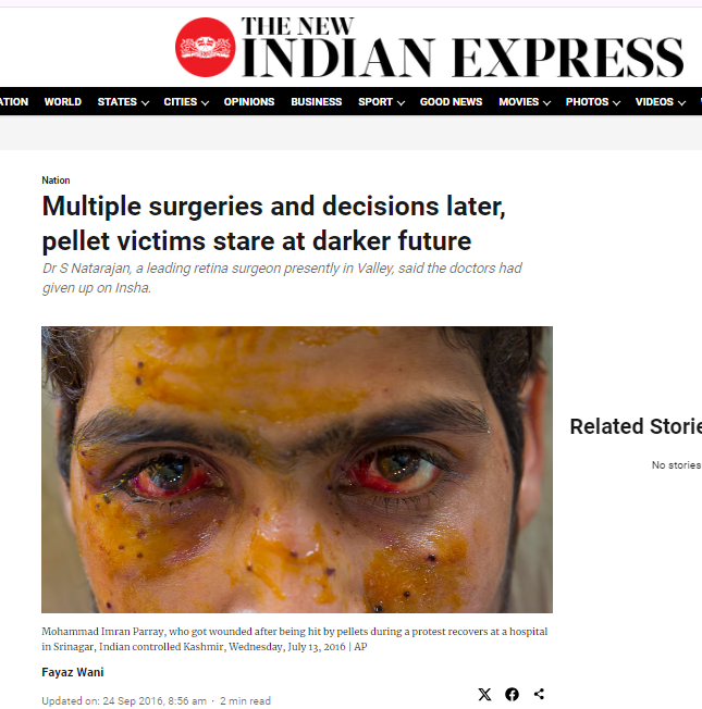 न्यू इंडियन एक्सप्रेस की रिपोर्ट में इस तस्वीर को कश्मीर का बताया गया है। कुछ कीवर्ड्स को गूगल सर्च करने पर हमें साल 2016 में ही प्रकाशित कई मीडिया रिपोर्ट्स में यह तस्वीर मिली। 30 जुलाई 2016 को टाइम्स ऑफ़ इंडिया द्वारा प्रकाशित कश्मीर में पैलेट गन के इस्तेमाल विषय से जुड़ी रिपोर्ट में भी इस तस्वीर को देखा जा सकता है।