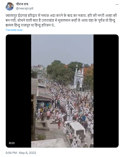सोशल मीडिया पर एक ईदगाह के बाहर की भीड़ का वीडियो वायरल है। एक एक्स (पूर्व में ट्विटर) पोस्ट के साथ दावा किया गया है कि 20 वर्ष पहले हल्द्वानी की मुस्लिम जनसंख्या एक प्रतिशत थी जो अब बढ़कर बीस प्रतिशत हो गयी है।