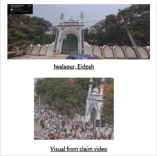 पड़ताल में आगे हमने ज्वालापुर हरिद्वार के ईदगाह को गूगल स्ट्रीट-व्यू पर खोजा। मिलान करने पर देखा जा सकता है कि वायरल वीडियो हरिद्वार स्थित ज्वालापुर ईदगाह का ही है। वायरल और प्राप्त रिपोर्ट में मौजूद वीडियो में दिख रही ईदगाह की बनावट, चारदीवारी और दीवारों का रंग एक है।