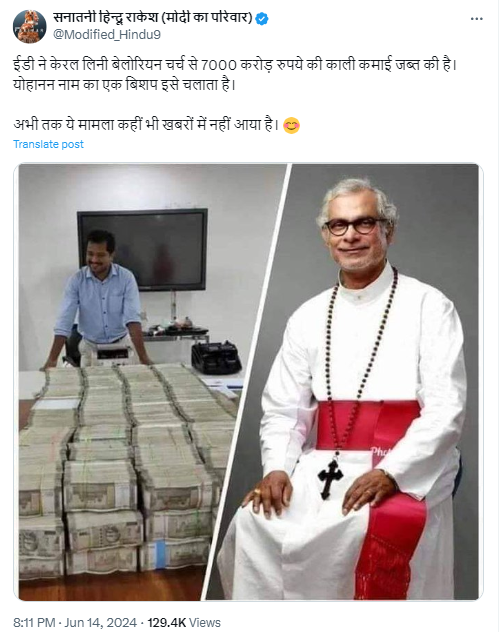 14 जून 2024 को एक्स यूजर ने दो तस्वीरों का एक कोलाज पोस्ट करते हुए कैप्शन में लिखा है, “ईडी ने केरल लिनी बेलोरियन चर्च से 7000 करोड़ रुपये की काली कमाई जब्त की है। योहानन नाम का एक बिशप इसे चलाता है। अभी तक ये मामला कहीं भी खबरों में नहीं आया है।” कोलाज की एक तस्वीर में पैसों की बहुत सारी गड्डियां रखी नजर आ रही हैं, और दूसरी तस्वीर में नजर आ रहे व्यक्ति को योहानन नामक बिशप बताया गया है। एक्स पोस्ट का आर्काइव यहाँ देखें।