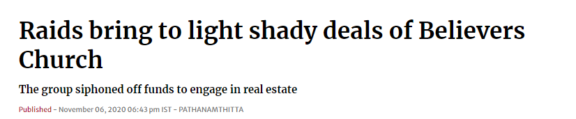 इस छापेमारी पर प्रकाशित मीडिया रिपोर्ट्स के अनुसार बिलिवर्स ईस्टर्न चर्च में आयकर विभाग का छापा नवंबर 2020 में पड़ा था। इस दौरान केरल में बिलिवर्स ईस्टर्न चर्च के 40 से ज्यादा केंद्रों पर आयकर विभाग की छापेमारी हुई थी। इस दौरान थिरुवेल्ला में बिलिवर्स ईस्टर्न चर्च के मुख्यालय की पार्किंग में खड़ी एक गाड़ी की डिक्की से आयकर विभाग को 57 लाख रुपये प्राप्त हुए थे। चर्च पर गरीबों के नाम पर विदेशों से मिले दान को रियल एस्टेट और निजी निवेशों में खर्च करने का आरोप लगा था। अधिकारियों के हवाले से रिपोर्ट में बताया गया है कि आयकर विभाग चर्च के पिछले 10 सालों के लेन-देन का हिसाब देख रहा था और इस दौरान गृह मंत्रालय ने बिलीवर्स ईस्टर्न चर्च का FCRA अकाउंट बंद कर दिया था। मीडिया रिपोर्ट्स को यहाँ, यहाँ और यहाँ पढ़ें।