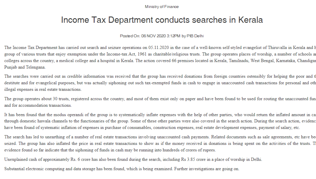 वित्त मंत्रालय की आधिकारिक वेबसाइट पर भी 6 नवंबर 2020 को आयकर विभाग द्वारा जारी की गई एक प्रेस विज्ञप्ति में केरल में हुई इस छापेमारी के दौरान, 6 करोड़ रुपये जब्त किए जाने की जानकारी दी गयी है।