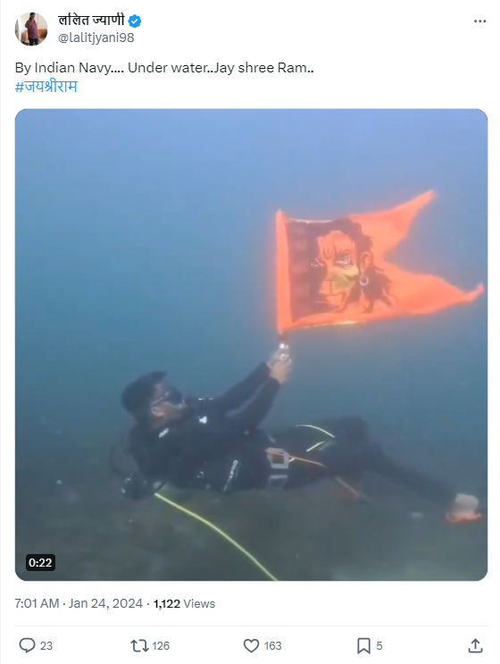 ललित ज्याणी नामक वेरीफाइड एक्स यूजर द्वारा 24 जनवरी 2024 को शेयर किये गए पोस्ट में एक व्यक्ति पानी के अंदर भगवान हनुमान की छवि वाला भगवा झंडा फहराते हुए नज़र आ रहा है। इस वीडियो के साथ एक राम भजन गीत भी जोड़ा गया है। वीडियो के साथ कैप्शन में लिखा गया है ‘भारतीय नौसेना द्वारा… पानी के अंदर…’ कैप्शन के साथ जय श्री राम हैशटैग भी लगाया गया है। इस पोस्ट का आर्काइव यहाँ देखा जा सकता है।