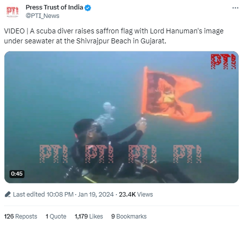 कुछ कीवर्ड्स को गूगल सर्च करने पर हमें PTI द्वारा 19 जनवरी 2024 को साझा किया गया एक्स पोस्ट मिला। इस पोस्ट में बताया गया है कि यह वीडियो गुजरात के शिवराजपुर में समुद्र तट पर एक स्कूबा गोताखोर के समुद्र में पानी के नीचे भगवान हनुमान की छवि वाले भगवा झंडा फहराने का है।