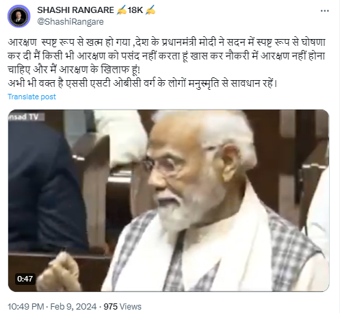 सोशल मीडिया पर यह दावा तेजी से वायरल हो रहा है कि प्रधानमंत्री नरेंद्र मोदी ने सदन में घोषणा की है कि वे आरक्षण के खिलाफ हैं। एक वीडियो के माध्यम से यह दावा सोशल मीडिया पर शेयर किया जा रहा है। वीडियो में प्रधानमंत्री कहते दिख रहे हैं कि ”मैं किसी भी आरक्षण को पसंद नहीं करता और खासकर नौकरी में कतई नहीं। मैं ऐसे किसी भी कदम के खिलाफ हूँ जो अकुशलता को बढ़ावा दे.. जो दोयम दर्जे की तरफ ले जाए। SC, ST, OBC को आरक्षण मिला तो सरकारी काम का स्तर गिर जायेगा।”