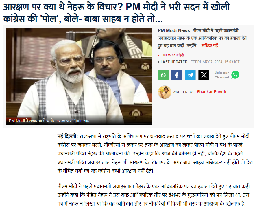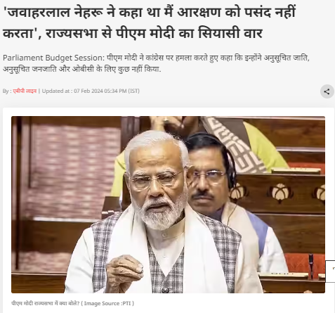 7 फरवरी 2024 को एबीपी न्यूज़ और न्यूज़ 18 द्वारा प्रकाशित रिपोर्ट में बताया गया है कि 7 फरवरी को राज्यसभा में प्रधानमंत्री मोदी ने आरक्षण के मुद्दे पर कांग्रेस की आलोचना करते हुए कहा कि पूर्व प्रधानमंत्री पंडित जवाहरलाल नेहरू भी आरक्षण के खिलाफ थे। इसी क्रम में प्रधानमंत्री मोदी ने पंडित नेहरू के एक आधिकारिक पत्र का हवाला देते हुए कहा कि उस वक्त पंडित नेहरू ने आधिकारिक तौर पर देशभर के मुख्यमंत्रियों को पत्र लिखकर कहा था कि वे व्यक्तिगत तौर पर नौकरियों में किसी भी तरह के आरक्षण के खिलाफ हैं।