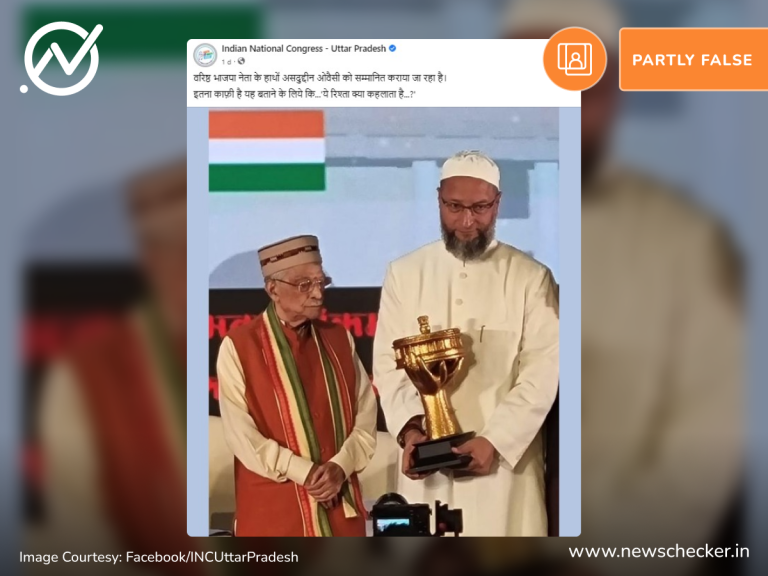 सोशल मीडिया पर एक तस्वीर शेयर कर यह दावा किया जाने लगा कि बीजेपी नेता मुरली मनोहर जोशी ने AIMIM सांसद असदुद्दीन ओवैसी को सम्मानित किया। हमारी पड़ताल में यह दावा भ्रामक साबित हुआ। फैक्ट चेक यहां पढ़ा जा सकता है।