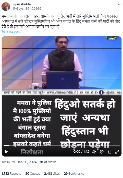 विजय शुक्ला नामक एक्स यूजर ने 30 जनवरी 2024 को एक पोस्ट में लिखा है कि “ममता बानो का असली चेहरा सामने आया पुलिस भर्ती में सारे मुस्लिम भर्ती किए सरकारी अस्पताल में सारे डॉक्टर मुस्लिम फिर भी अगर बंगाल के हिंदू ममता बानो की पार्टी को बोट देते हैं तो डूब मरो आपका ज़मीर मर चुका है।” इस पोस्ट के साथ एक वीडियो मौजूद है, जिसमें कहा जा रहा है कि पश्चिम बंगाल में हाल ही में पुलिस भर्ती हुई है और पुलिस रिक्रूटमेंट बोर्ड की लिस्ट में चयनित सब- इंस्पेक्टर के लगभग सभी नाम मुस्लिम हैं।