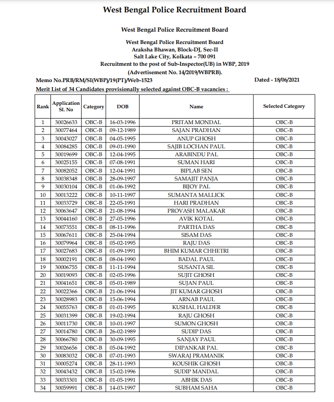 अब हमने इस वीडियो में दिखाई गयी सूची की सत्यता जानने के लिए पश्चिम बंगाल पुलिस भर्ती बोर्ड की आधिकारिक वेबसाइट पर चयनित सब-इंस्पेक्टर की इस लिस्ट को ढूंढा। इस दौरान हमें पता चला कि यह सूची 18 फरवरी, 2021 को पश्चिम बंगाल पुलिस रिक्रूटमेंट बोर्ड की ओर से जारी की गयी थी। वेबसाइट पर उपलब्ध इस सूची में 50 नाम अंकित हैं, जिनमें से अधिकांश मुस्लिम हैं, लेकिन गौर से देखने पर हम पाते हैं कि यह सूची सिर्फ ओबीसी (अन्य पिछड़ा वर्ग)-ए की रिक्तियों के लिए चयनित उम्मीदवारों की है।