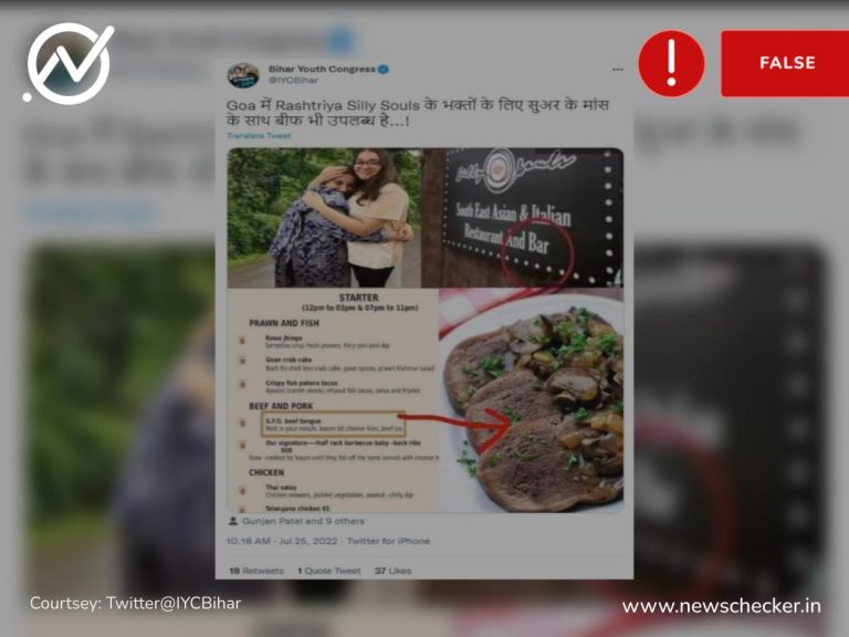 सोशल मीडिया पर एक पोस्ट के जरिए दावा किया जाने कि स्मृति ईरानी की बेटी के रेस्टोरेंट में बीफ और पोर्क परोसा जाता है। हमारी पड़ताल में यह दावा फर्जी साबित हुआ।