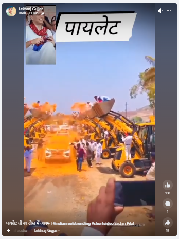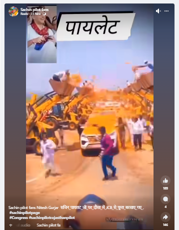 तेजी से वायरल हो रही एक फेसबुक रील में ये दिख रहा है कि गाड़ियों के एक काफिले पर जेसीबी से पुष्प वर्षा हो रही है। इस पोस्ट के साथ दावा किया जा रहा है कि यह वीडियो राजस्थान स्थित दौसा का है, जहां कांग्रेस नेता सचिन पायलट के काफ़िले पर जेसीबी से फूल बरसाए गए।