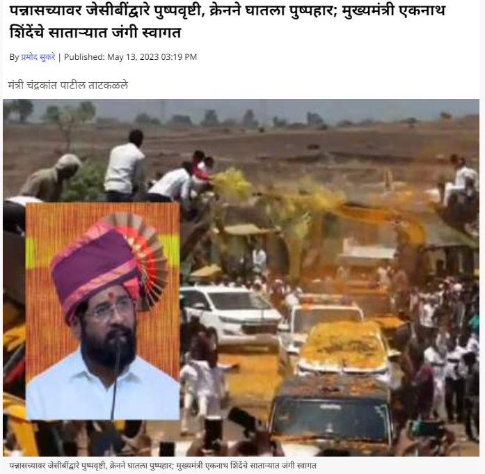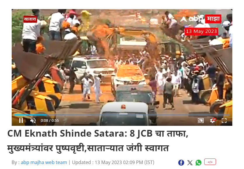 Newschecker ने वायरल वीडियो की पड़ताल के लिए सबसे पहले संबधित कीवर्ड्स के साथ गूगल सर्च किया। हमें ABP मराठी की वेबसाइट पर 13 मई,2023 को प्रकाशित एक रिपोर्ट मिली। इस वीडियो रिपोर्ट को देखने पर हमने पाया कि यह वीडियो महाराष्ट्र स्थित सतारा का है, जहाँ जेसीबी से पुष्प वर्षा कर महाराष्ट्र के मुख्यमंत्री एकनाथ शिंदे का स्वागत किया गया था।