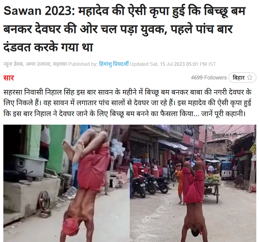 अपनी पड़ताल की शुरुआत में हमने संबंधित कीवर्ड को गूगल सर्च किया, जिससे हमें प्रभात खबर और अमर उजाला द्वारा प्रकाशित रिपोर्ट मिली। इन रिपोर्ट्स से हमें जानकारी मिलती है कि वीडियो में दिख रहे व्यक्ति का नाम निहाल सिंह है। वह बिहार के सहरसा जिले के निवासी हैं। ख़बरों में निहाल सिंह द्वारा बताया गया है कि छह साल पहले वे पहली बार दंड प्रणाम देते हुए बाबाधाम गए थे और अब बाबा की ही प्रेरणा से हाथ के बल चलकर बिच्छू आकार लिये बाबाधाम तक जा रहे हैं।