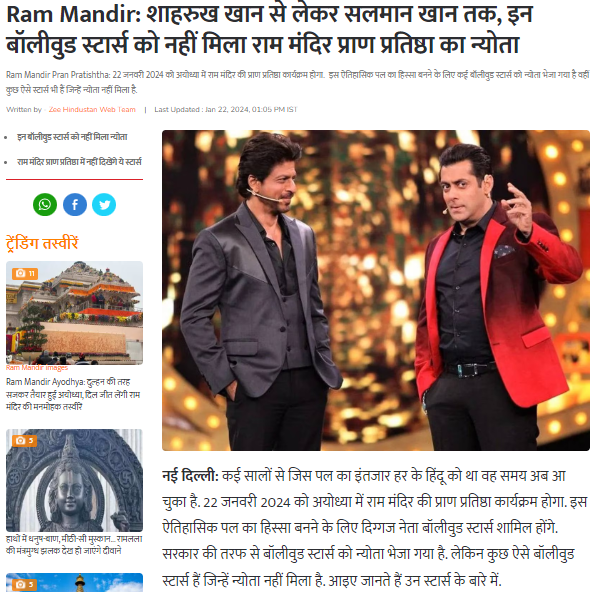 वायरल वीडियो में किये गए दावे की जाँच के लिए हमने शाहरुख़ खान द्वारा अयोध्या जाने की जानकारी इंटरनेट पर खोजी। लेकिन इंटरनेट पर कहीं भी ऐसी खबर मौजूद नहीं थी जो इस बात की पुष्टि करे कि शाहरुख़ खान अयोध्या गए थे। हमने पाया कि मौजूद खबरों में सिर्फ यही चर्चा है कि शाहरुख़ खान को प्राण प्रतिष्ठा कार्यक्रम में न्योता नहीं दिया गया है। 22 जनवरी 2024 को Zee हिन्दुस्तान द्वारा प्रकाशित रिपोर्ट के अनुसार, शाहरुख खान को राम मंदिर में होने वाली प्राण-प्रतिष्ठा का न्योता नहीं मिला है। फ्री प्रेस जर्नल द्वारा 22 जनवरी 2024 को प्रकाशित रिपोर्ट में इस बात के अनुमान लगाए हैं कि शाहरुख़ खान को अयोध्या में हुई प्राण-प्रतिष्ठा कार्यक्रम का न्योता क्यों नहीं दिया गया होगा।
