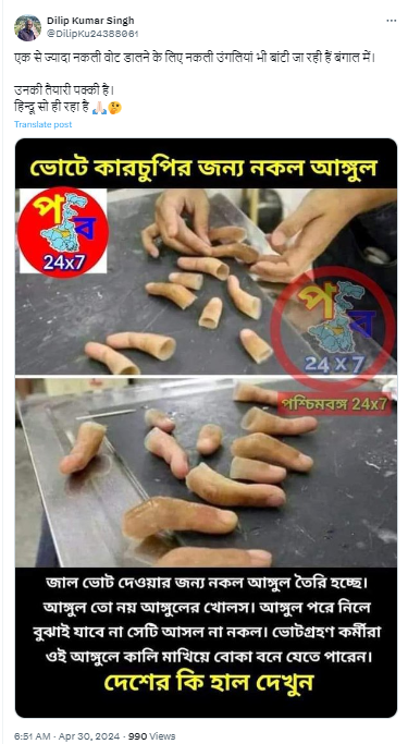 बंगाल में एक से ज्यादा नकली वोट डालने के लिए नकली उंगलियां बांटी जा रही हैं। एक्स पोस्ट का आर्काइव यहां देखें।