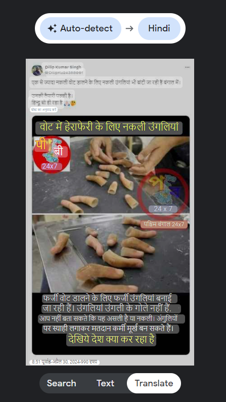 पड़ताल की शुरुआत में हमने दावे के साथ शेयर की गयी तस्वीर में लिखे तेलुगू टेक्स्ट का हिंदी अनुवाद किया। तस्वीर पर तेलुगु में लिखा है कि ”वोट में हेराफेरी के लिए नकली उंगलियां…फर्जी वोट डालने के लिए फर्जी उंगलियां बनाई जा रही हैं। आप नहीं बता सकते कि यह असली है या नकली। अंगुलियों पर स्याही लगाकर मतदान कर्मी मूर्ख बन सकते हैं। देखिये देश क्या कर रहा है”