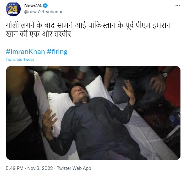 साल 2022 के नवंबर महीने में पूर्व प्रधानमंत्री इमरान खान की रैली में गोलीबारी हुई, जिसमें वो जख्मी हो गए। मीडिया संस्थानों ने इमरान खान की एक तस्वीर शेयर कर दावा किया कि यह तस्वीर उन पर हुए हमले के बाद की है। लेकिन यह दावा भ्रामक निकला। पूरा फैक्ट चेक यहां पढ़ा जा सकता है।