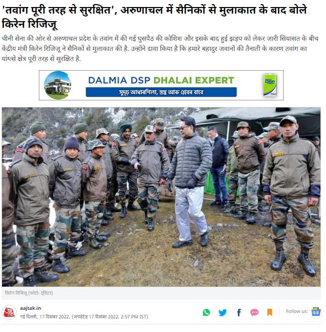 केंद्रीय कानून मंत्री किरण रिजिजू ने भारतीय जवानों के साथ अपनी एक तस्वीर शेयर कर बताया कि अरुणाचल प्रदेश के तवांग सेक्टर का यांगस्ते इलाका पूरी तरह से सुरक्षित है। इसके बाद कई मीडिया संस्थानों ने इस ट्वीट के आधार पर दावा किया कि किरण रिजिजू ने हाल में अरुणाचल प्रदेश का दौरा किया है। लेकिन यह दावा फर्जी निकाला। पूरा फैक्ट चेक यहां पढ़ा जा सकता है।