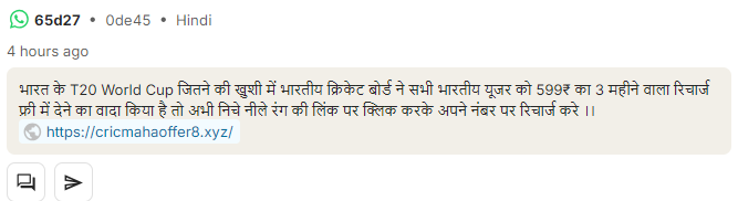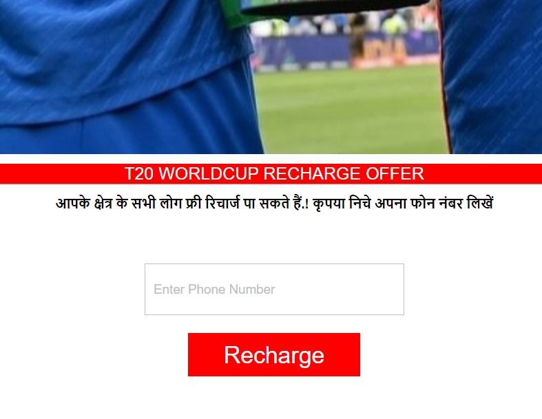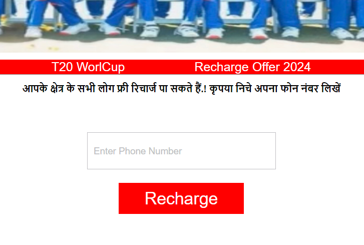 भारतीय क्रिकेट टीम ने शनिवार 29 जून को दक्षिण अफ्रीका को हराकर टी-20 वर्ल्ड कप अपने नाम कर लिया। जहाँ एक ओर भारत द्वारा 17 साल बाद फिर से टी-20 वर्ल्ड कप चैम्पियन बनने पर देश भर में जश्न मनाया जा रहा है, वहीं इस ख़ुशी में भारतीय यूजर्स को फ्री रिचार्ज दिए जाने के कई मैसेज सोशल मीडिया पर वायरल हो रहे हैं।