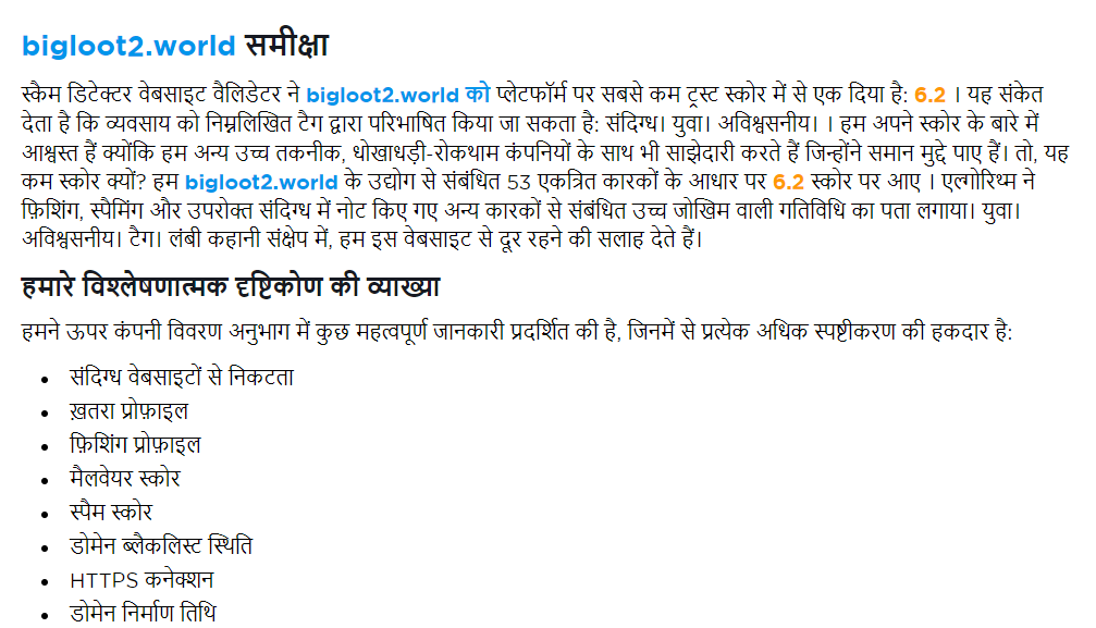 मुकेश अंबानी द्वारा फ्री रिचार्ज दिए जाने के दावे के साथ शेयर किया गया लिंक ‘bigloot2.world’ नामक वेबसाइट पर खुलता है। स्कैम डिटेक्टर इस वेबसाइट को विश्वसनीयता के कई मापदंडों पर 100 में से मात्र 6.2 (Trust Score) अंक देता है। स्कैम डिटेक्टर इस वेबसाइट को संदिग्ध, नई और अविश्वसनीय बताता है।