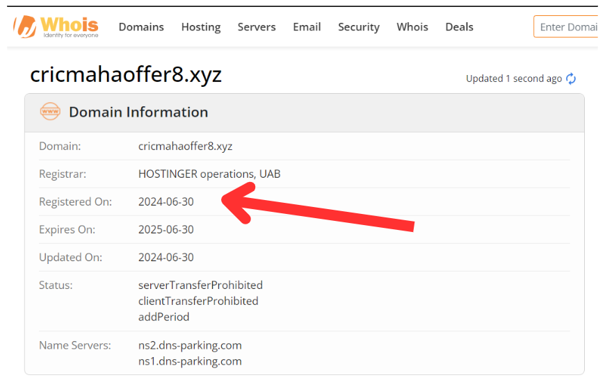 जांच में आगे हम ‘who is’ पर भी इन लिंक्स से जुड़ी अन्य जानकारियां खंगालते हैं। यहां बताया गया है कि ‘bigloot2.world’ का डोमेन और ‘cricmahaoffer8.xyz’ का डोमेन 30 जून 2024 को ही रजिस्टर कराया गया था।