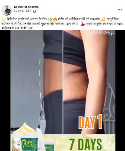 सोशल मीडिया पर एक वीडियो वायरल हो रहा है। वीडियो में दावा किया गया है कि अदरक का तेल और क्रीम लगाने से कुछ हफ्तों में पेट की चर्बी दूर हो जाती है। इस विज्ञापन में लुभावने वादों के साथ यह भी कहा गया है कि अभी दवा ऑर्डर करने पर 50 फ़ीसदी का डिस्काउंट मिलेगा।