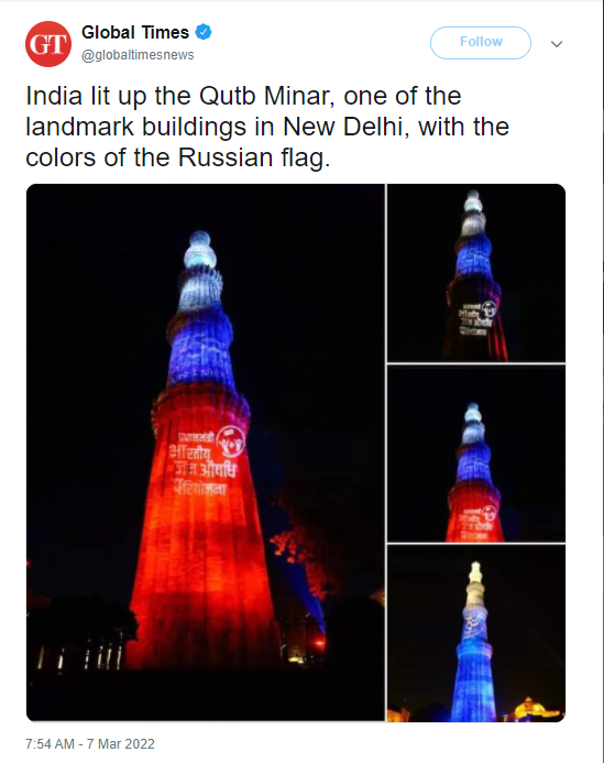 चीन के सरकारी अखबार ग्लोबल टाइम्स ( Global Times) ने दावा किया कि दिल्ली स्थित कुतुब मीनार ( Qutub Minar) को रूसी झंडे के रंग से सजा दिया गया।