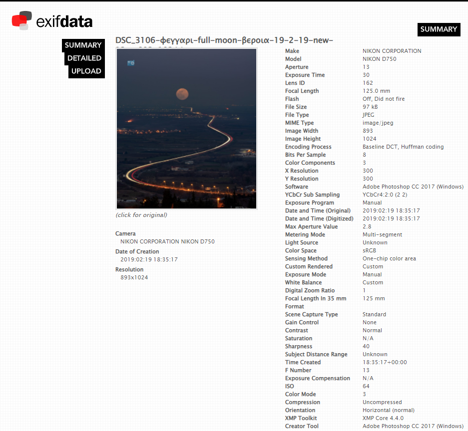 खोजने पर हमें इस तस्वीर का एक्सिफ डाटा भी मिल गया. यहां दी गई जानकारी से भी यही समझ आता है कि वायरल फोटो वेरिया शहर की है, जिसे 19 फरवरी 2019 को क्लिक किया गया था.