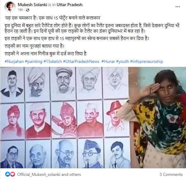 यूपी की नूरजहां नामक युवती ने एक बार में, एक हाथ से 15 महापुरुषों का स्केच बनाकर अपना नाम गिनीज बुक ऑफ वर्ल्ड रिकॉर्ड में दर्ज कराया है।