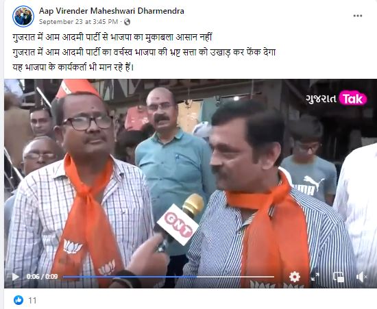 गुजरात में होने वाले आगामी विधानसभा चुनाव के लिए विभिन्न राजनीतिक दल जोर आजमाइश में लगे हैं। इसी कड़ी में सोशल मीडिया पर एक वीडियो वायरल है जिसमें एक व्यक्ति बता रहा कि गुजरात मेंं आम आदमी पार्टी का वर्चस्व है। इसे शेयर कर दावा किया जा रहा है कि गुजरात में बीजेपी के समर्थक भी आम आदमी पार्टी का वर्चस्व मान रहे हैं और ये भाजपा की भ्रष्ट सत्ता को उखाड़ फेकेगा।